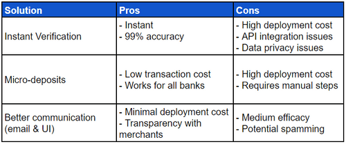 It seemed like a big reason for a push to work on a merchant payout failure solution was driven by the market; main competitors had an instant bank verification feature that allowed a major reduction of R03 and R04 returns.